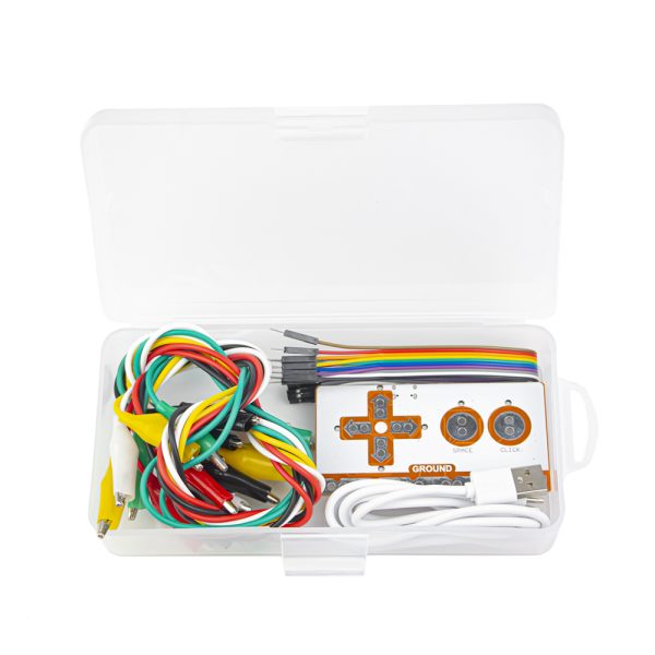 Además de la placa de control, el kit también incluye un cable USB tipo C para conectar Makey Makey a su computadora, permitiendo la comunicación y transferencia de datos de manera fácil y rápida. También contará con conectores caimán-caimán de diversos colores, que le ayudarán a realizar conexiones seguras y confiables entre Makey Makey y los objetos conductivos.